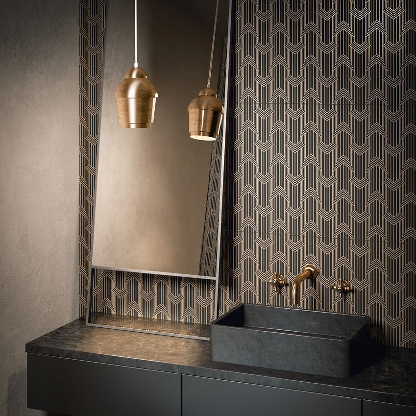 Inspired by Art Deco design with a cool modern air, ANN SACKS Ermanno metallic glazed porcelain tile is crafted in Italy and exclusive to ANN SACKS in the United States. Ermanno features slight variations in color and irregularities within the patterns for an organic, handcrafted appearance.