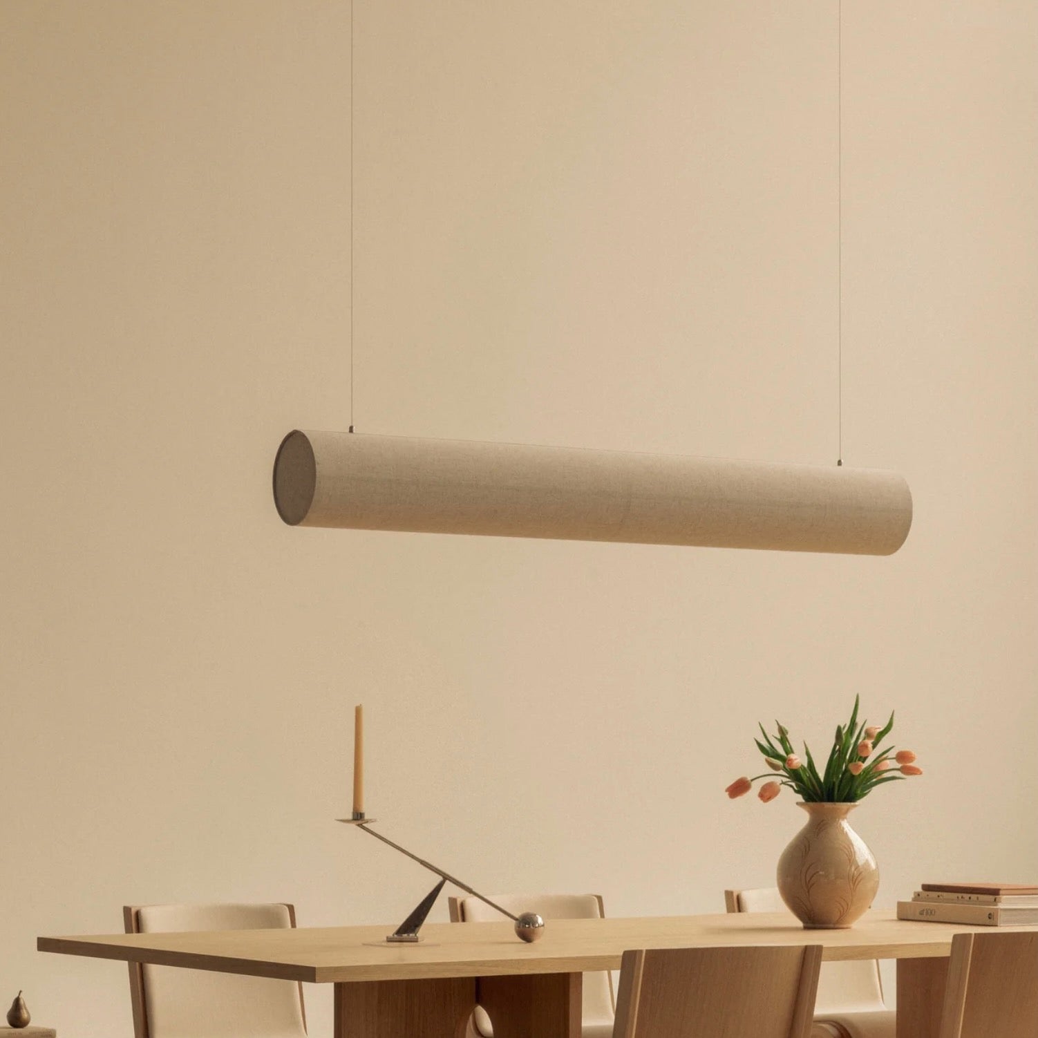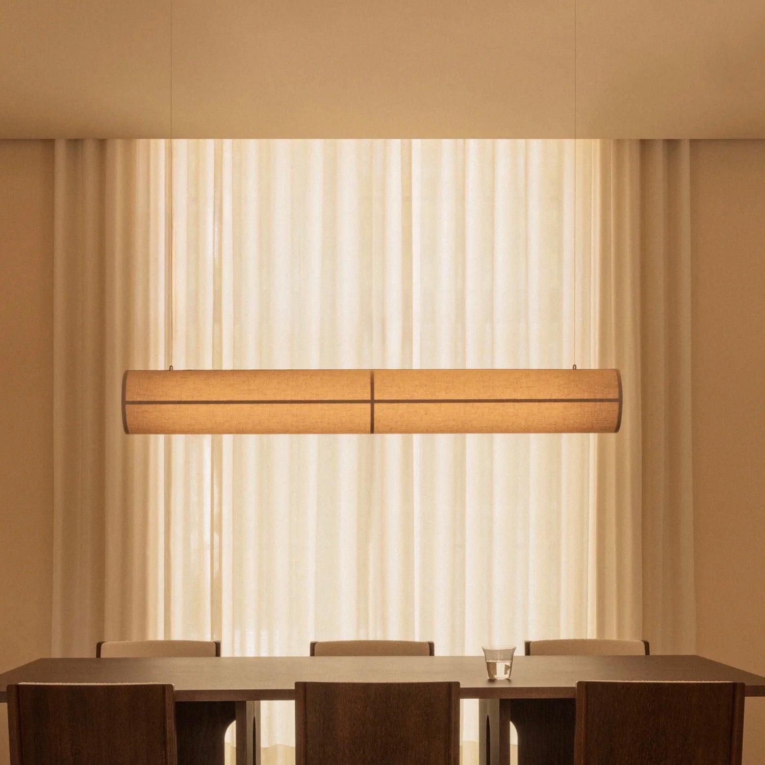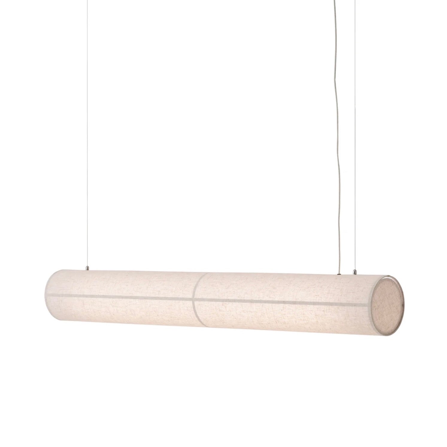 The Hashira Ceiling Lamp brings a warm glow and subtle tactility to spaces. It redefines the popular lighting collection with its horizontal form, delivering ambient lighting in a minimalist aesthetic. The streamlined lamp appears to float on air, suspended from the ceiling by wires, and its raw linen shade is held in place by magnets, eliminating the need for bulky screws. The dimmable, replaceable LED light source emits a warm glow, bright enough for tasks yet subtle enough to add ambiance.