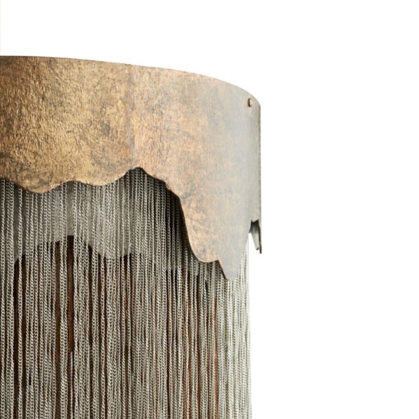 Descending from a circle canopy via a chain and slim stem, it uses a textured, naturally cut metal top to suspend lamping below. Small chains mellow the lamping, contrasting well with the solid top, expressing an intricately layered character as its form descends.