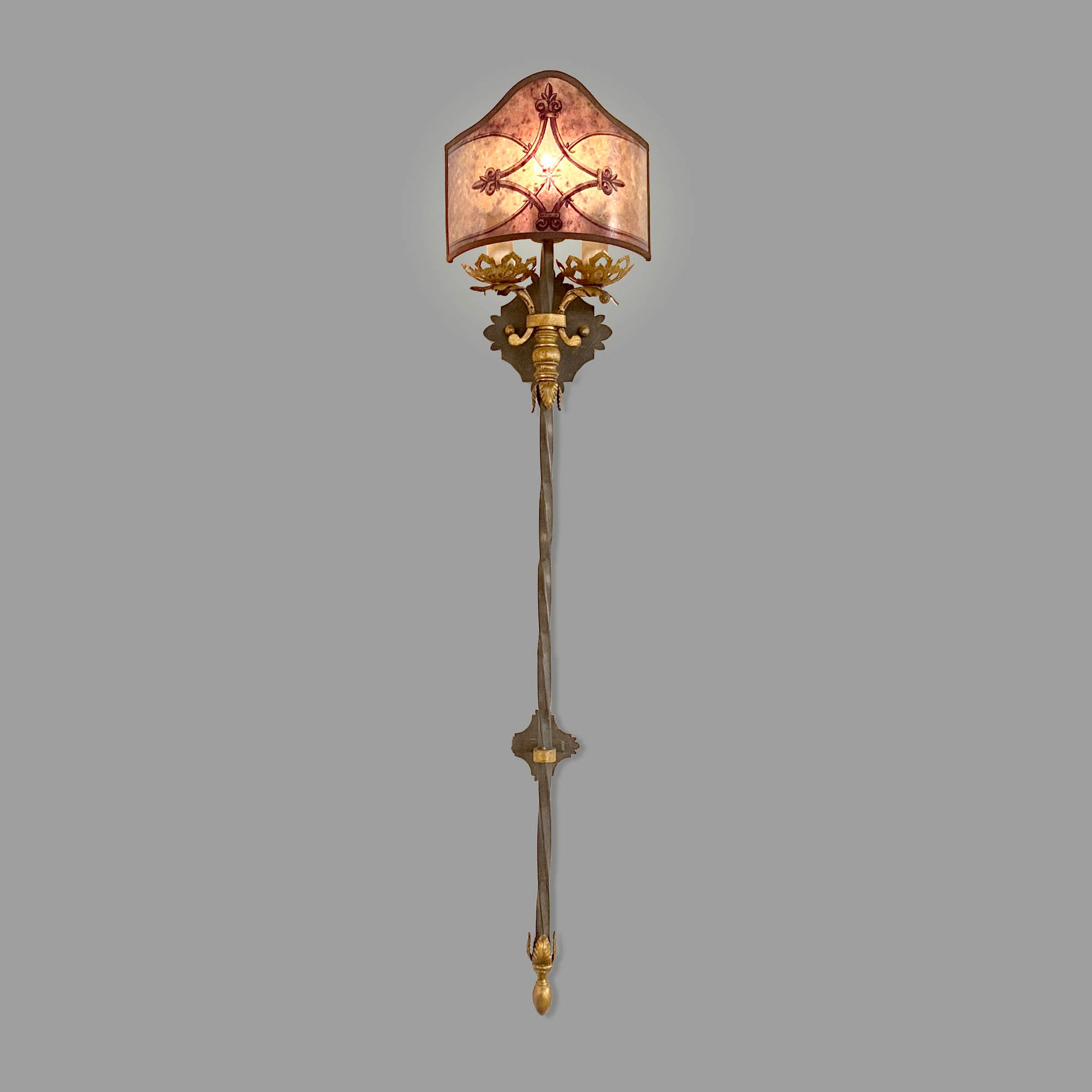 Wall sconce in rich umber with gilded accents. Features half shade of hand decorated mica panels.