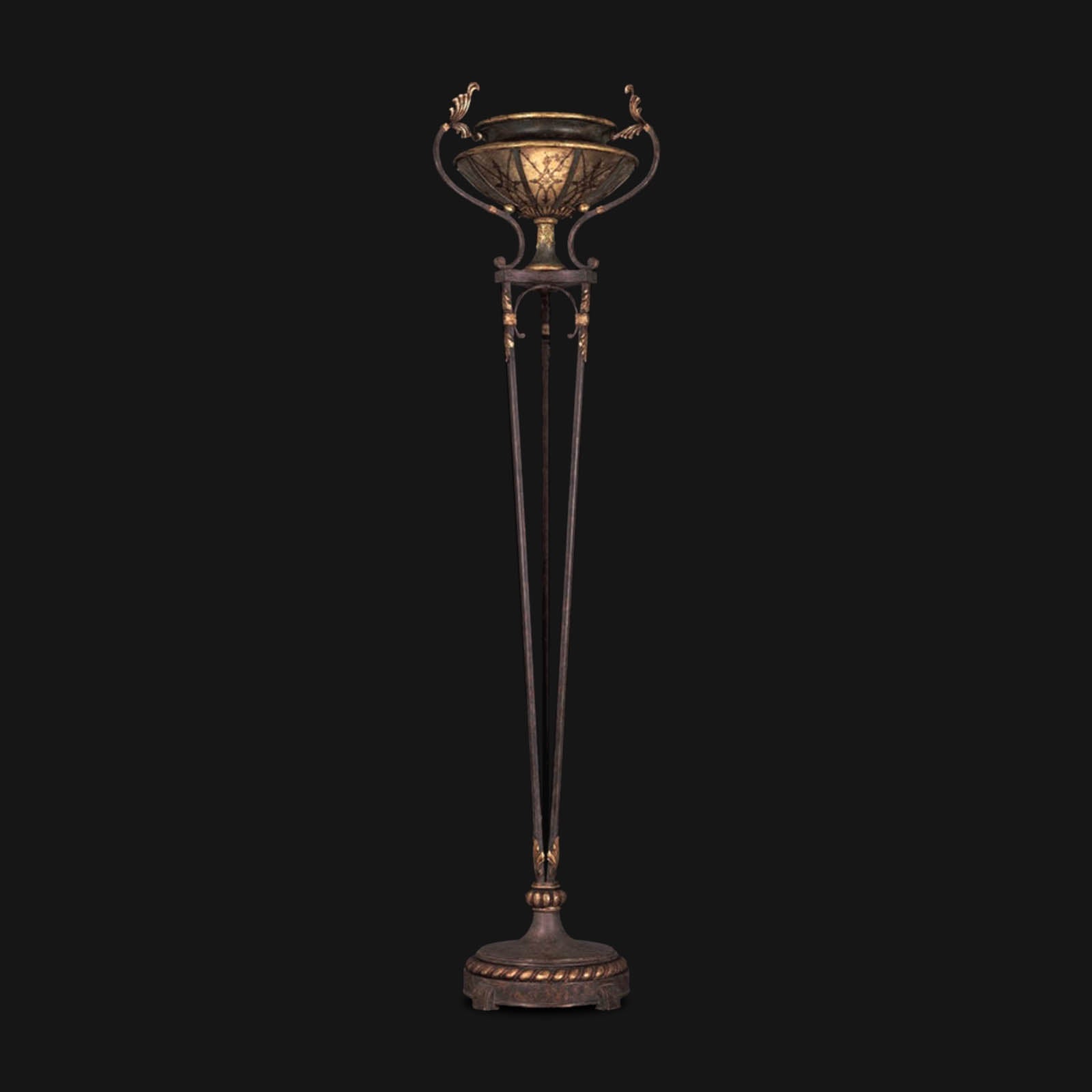 Torchiere in warm finish of rich umber with gilded accents. Hand-painted mica shade with fleuron and diamond designs.