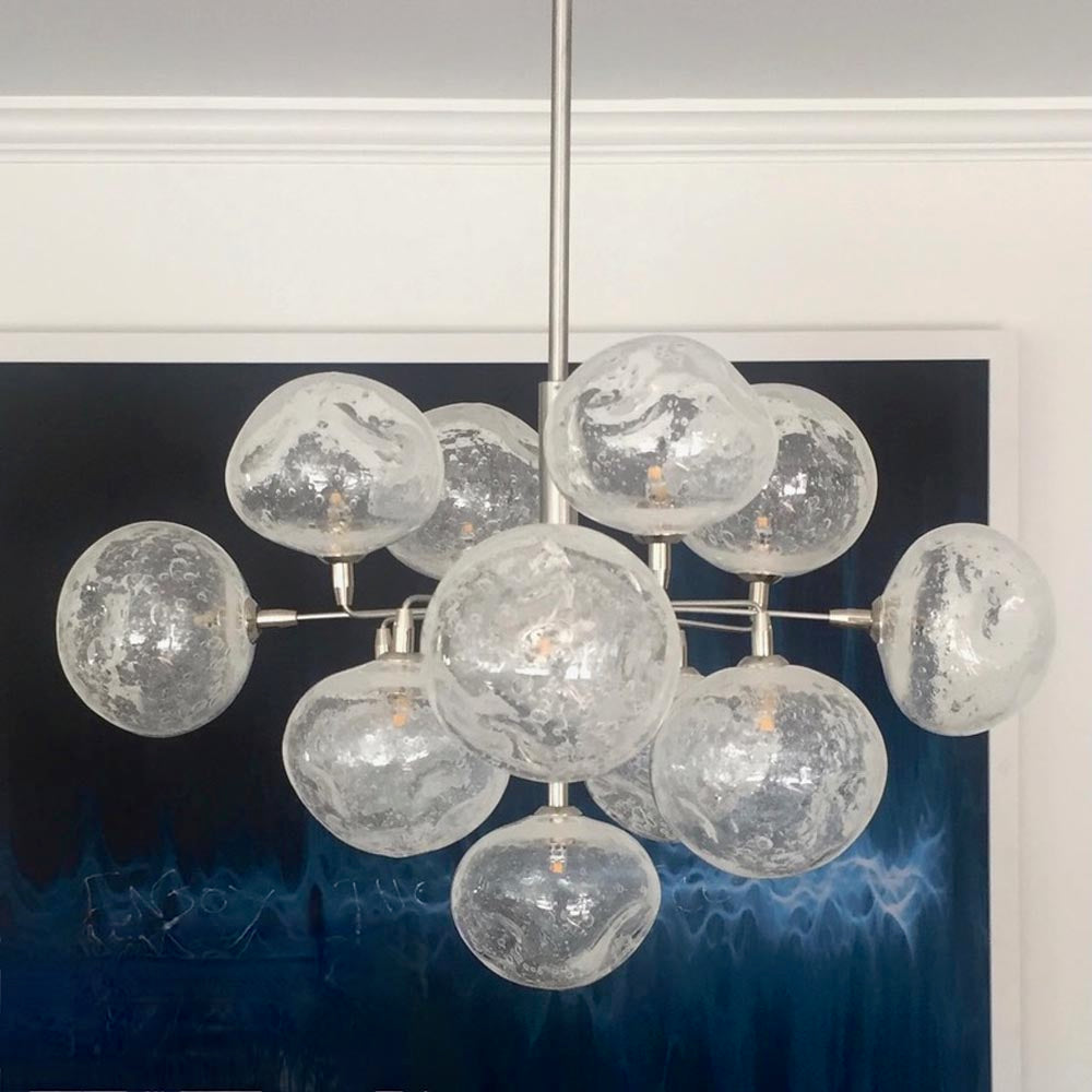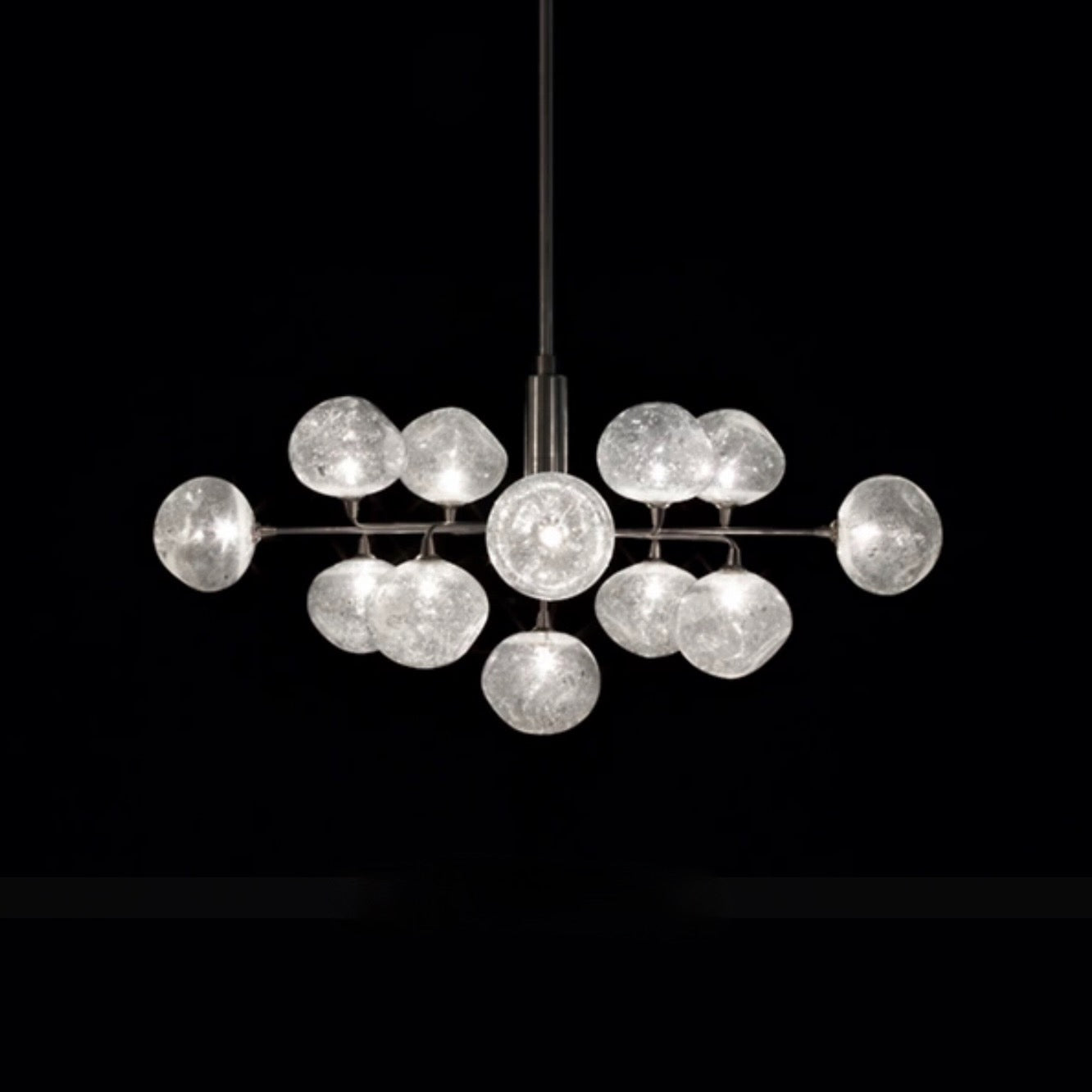Thirteen frosted glass globes hang suspended in the air by a set of stainless-steel arms, producing an ambient light that is sure to catch an eye or two. Fascinating in appearance without being too loud, this fixture finds a home comfortably in residential use or even commercial, making any modern environment truly standout.