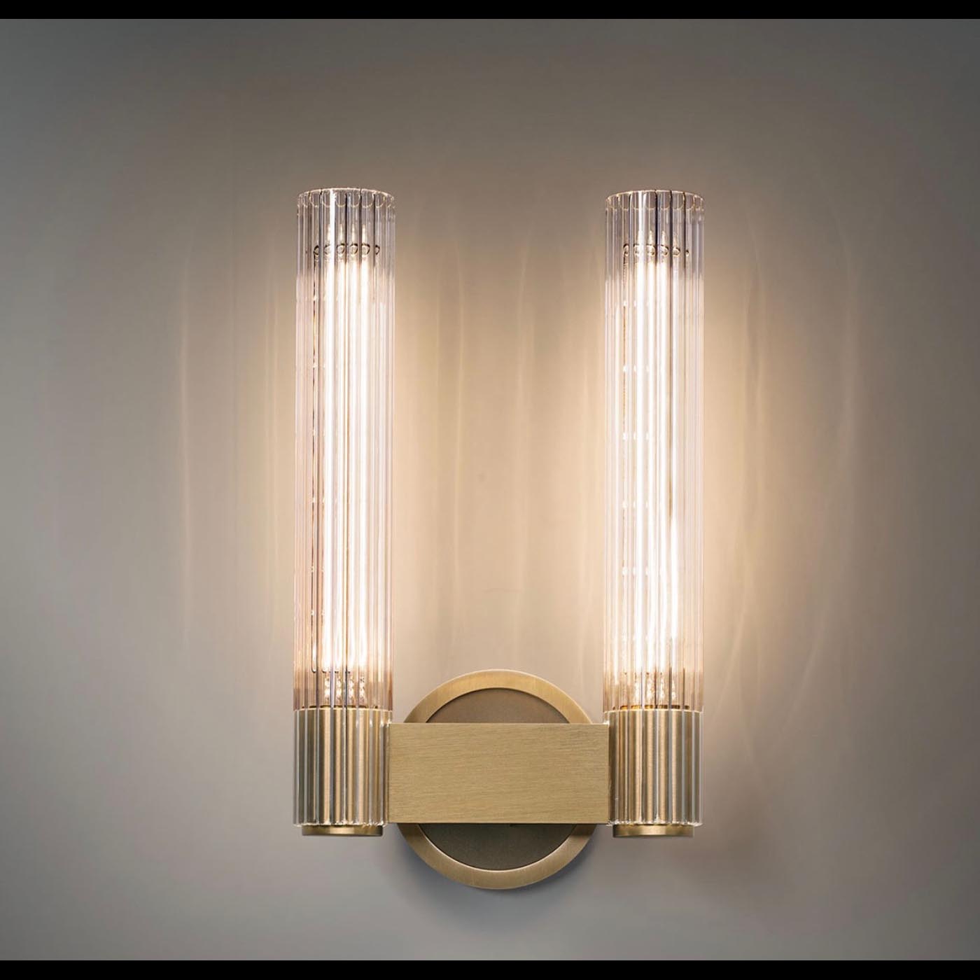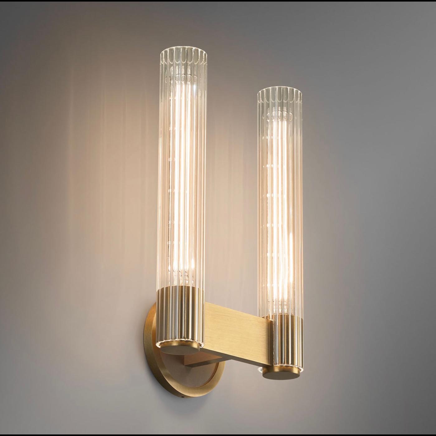 The Pastis Double Sconce is machined from solid brass. All parts are hand polished and patina’d. The reeded borosilicate glass shades are notched to delicately rest on each brass arm.