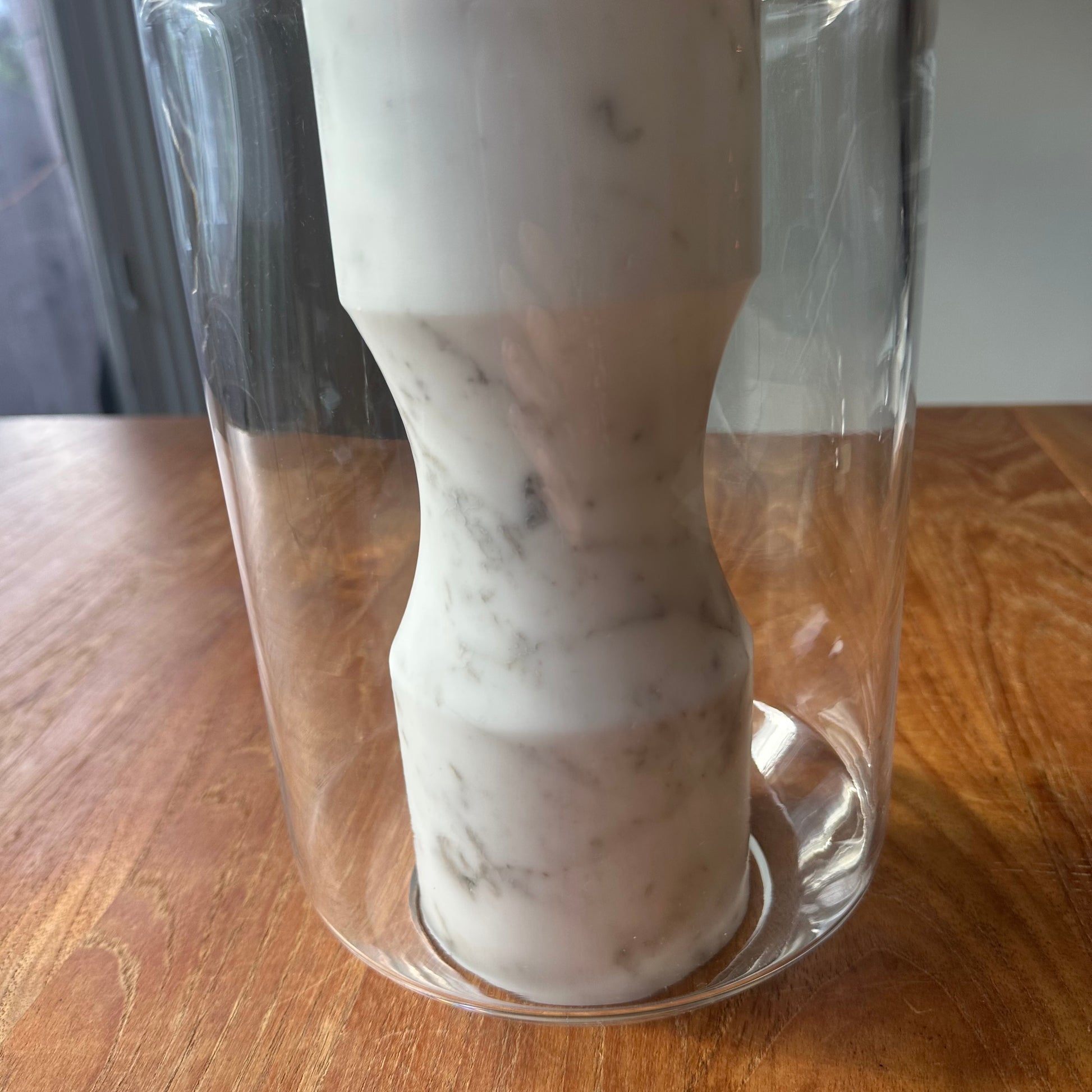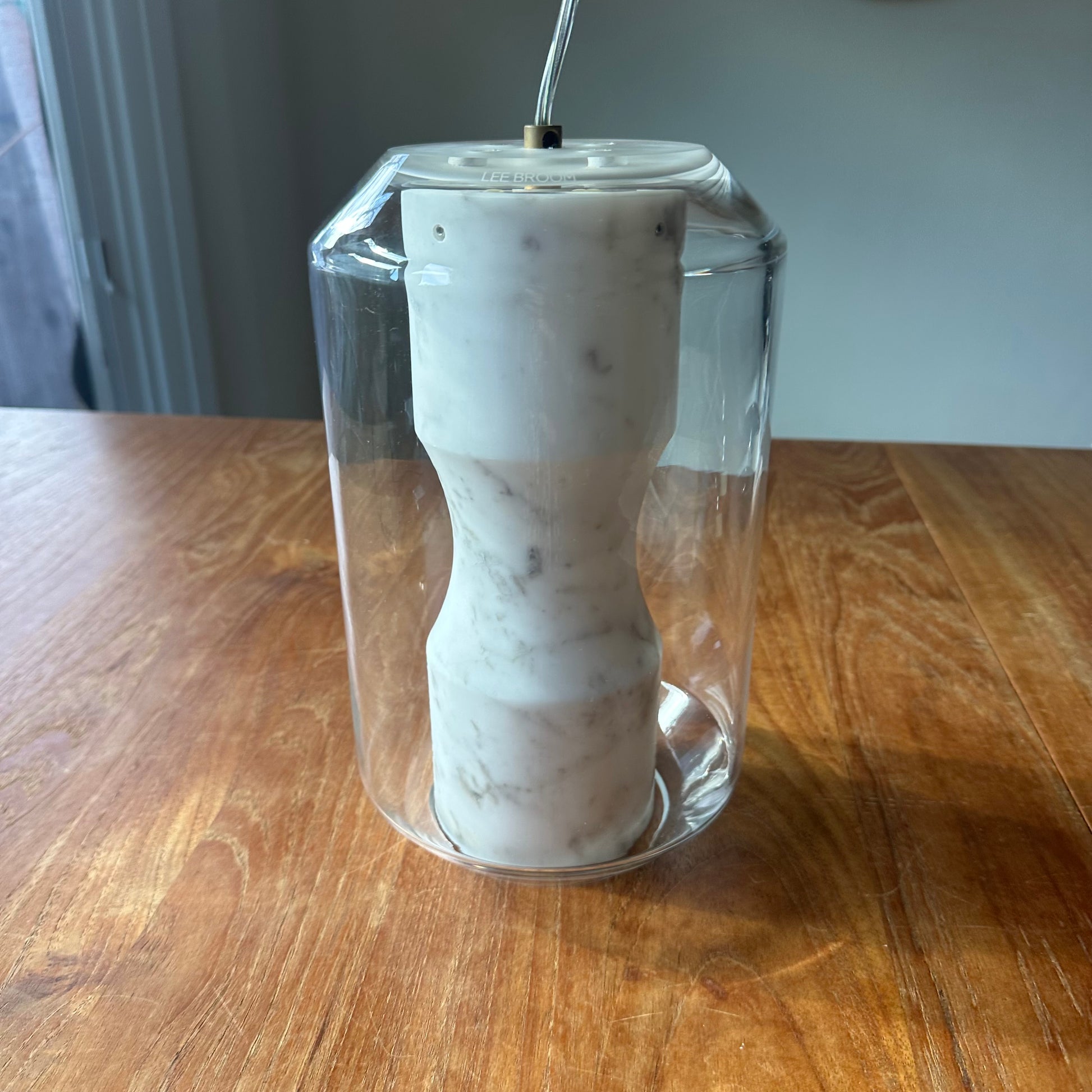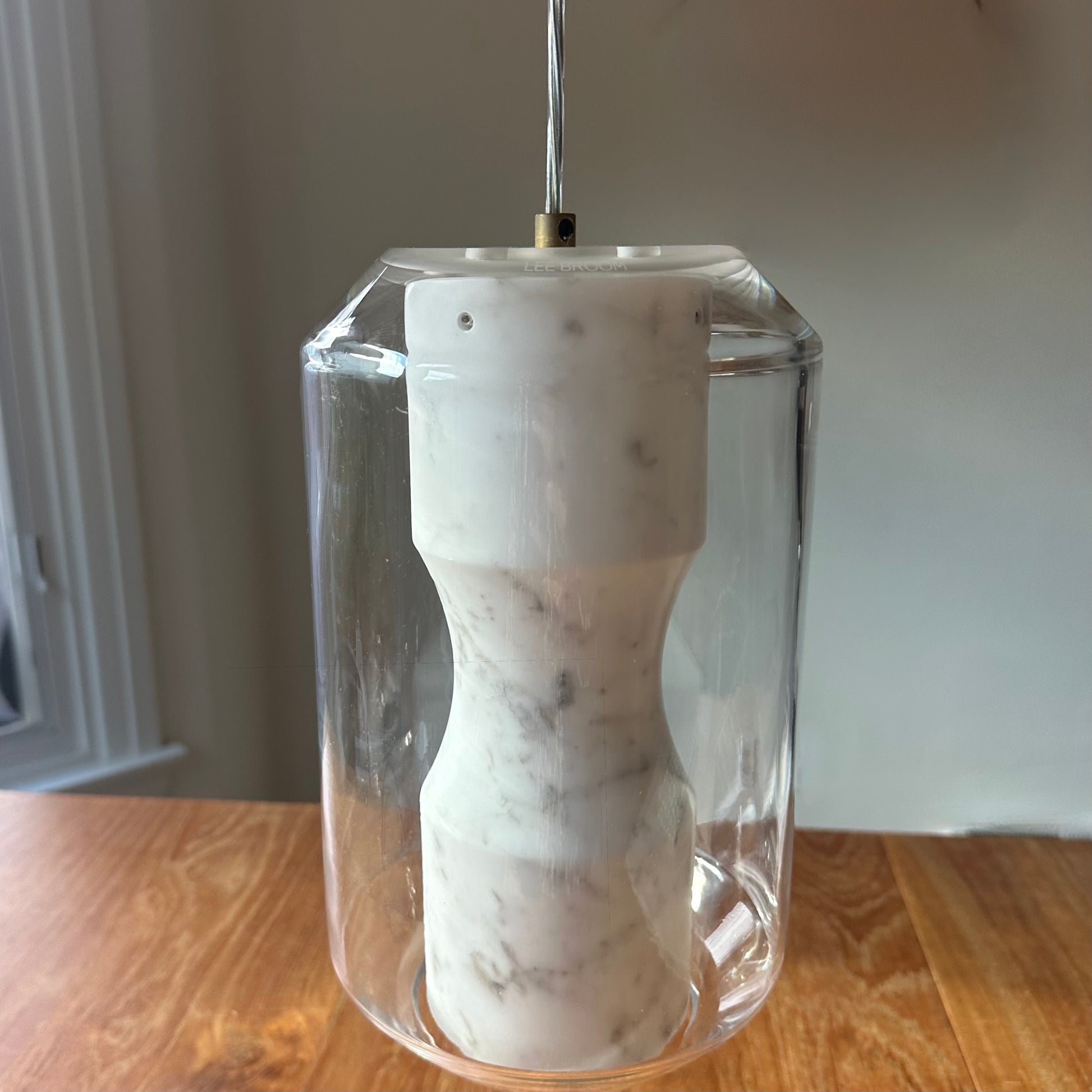 Housing a sculptural Carrara marble diffuser within a lead crystal vessel, this pendant expresses the translucent qualities of marble with gentle luminosity and directional downlight.