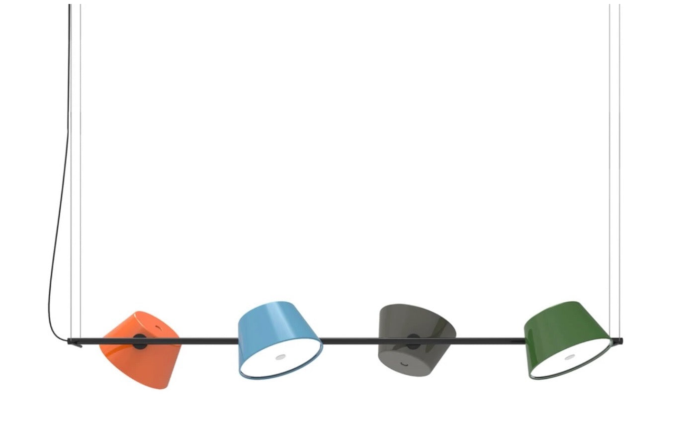 Marset’s adapts Tam Tam’s linear style in a smaller 4-light model for more compact spaces where an elongated fixture is still desired. Berlin-based designer Fabien Dumas’ multicolor composition of lacquered aluminum shades come attached to a hanging pole and each one can be positioned to face downward, sideways or upward to reflect off the ceiling. And an opalescent methacrylate diffuser covers the open end of each shade to soften the overall illumination.