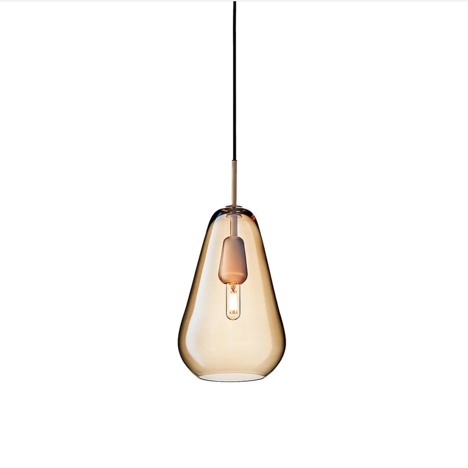 This pendant's droplet-shaped glass shade was inspired by rain drops reflecting the singular tones of Nordic light. Composed of mouth-blown glass handpainted in a delicate golden color and complementary light gold metal.