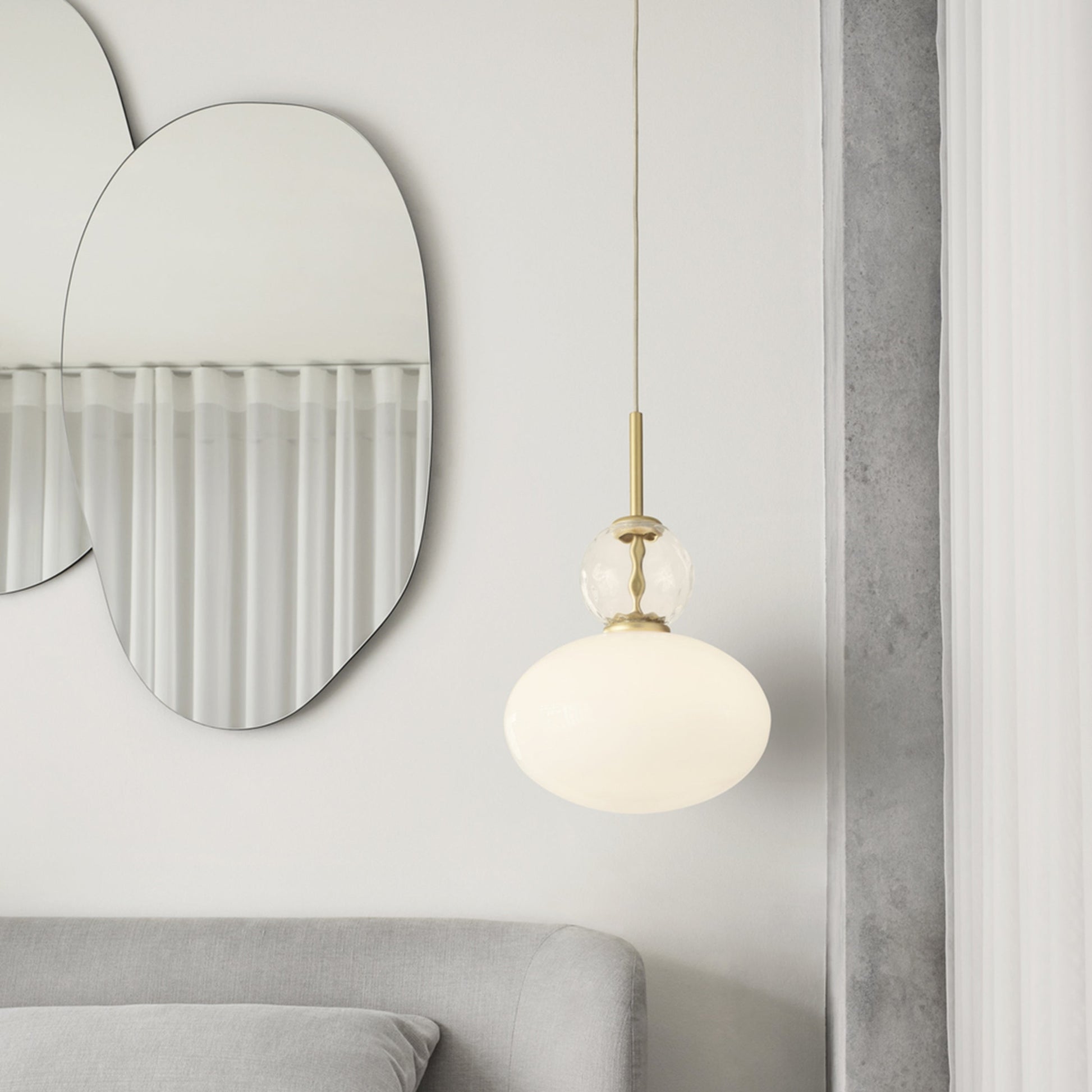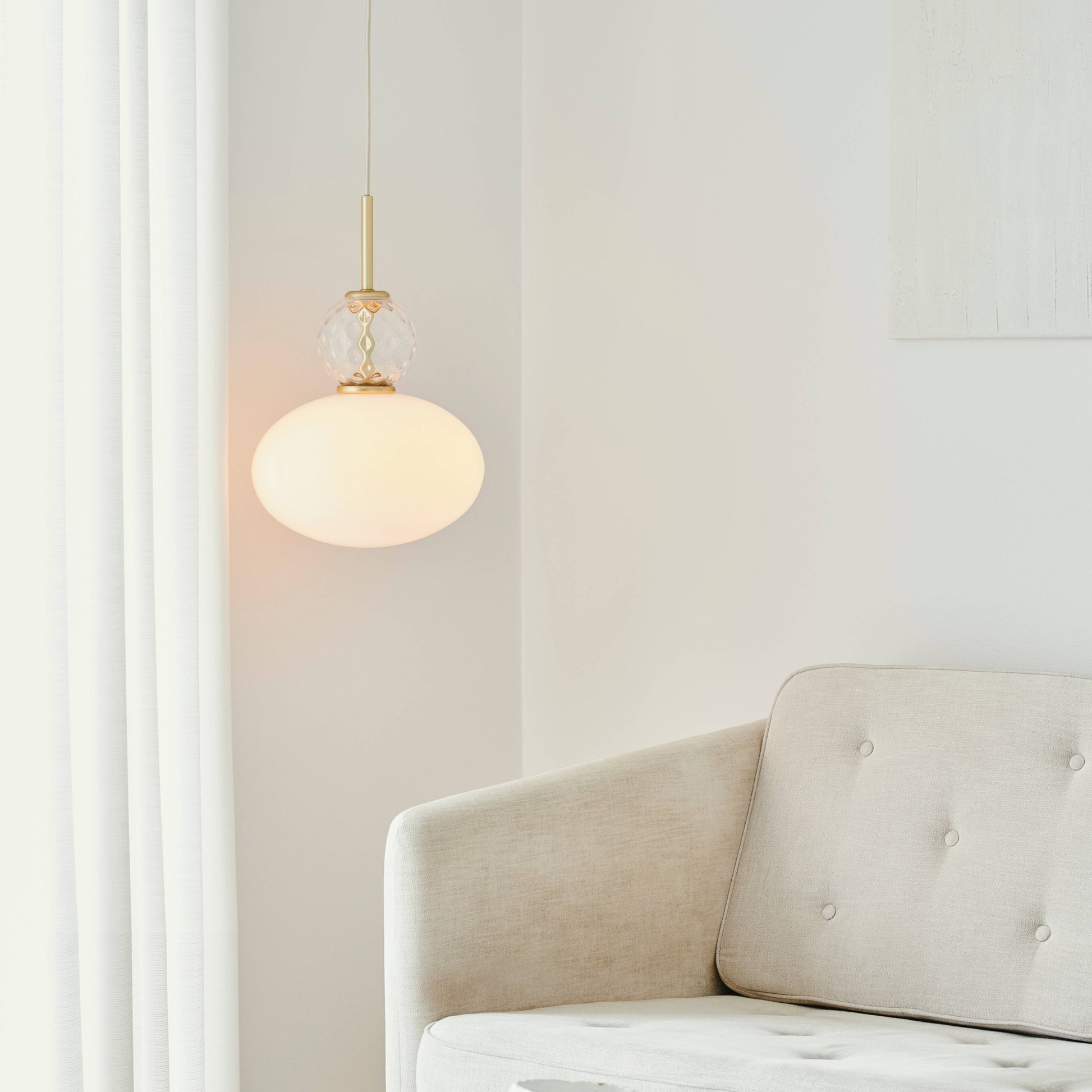 In a stunning combination of mouth-blown glass and satin brass, Rizzatto 32 radiates soft and even illumination, making it ideal above a dining table or sofa. The light unfolds from its source and diffuses beautifully through the opal-white oval, accented by the mottled clear orb above. Namesake designer Paolo Rizzato collaborated with Danish brand Nuura on the timeless height-adjustable pendant, a first for the much-heralded Milanese creator since forming his original company Luceplan in 1978.