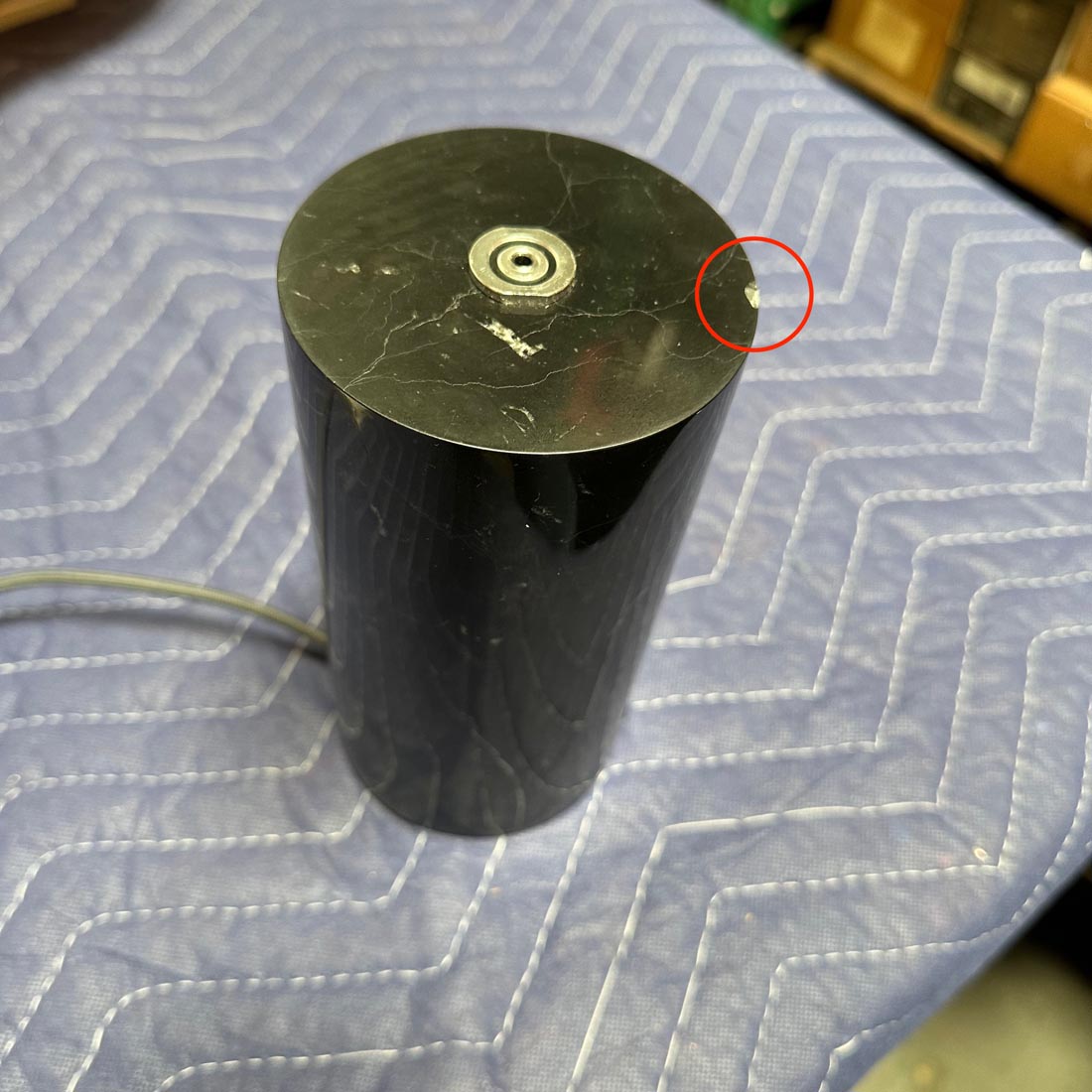 *This light is in very good condition. It was purchased from a showroom and returned. There is a 1/4" chip on the top of the marble base. The chip looks like white veining that is throughout the base. Please see attached photos.*