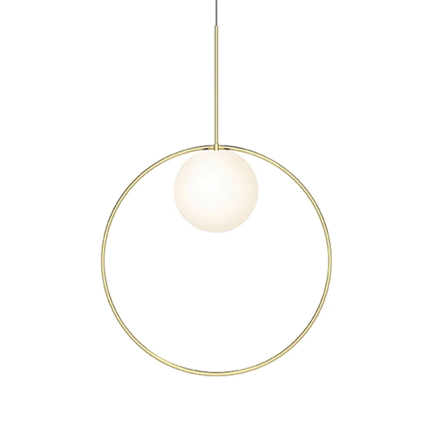 Bola Halo adds a gleaming ring encircling Pablo’s signature pendant for a captivating illusion of movement. Balanced over the elegant opal glass globe, the metal ring can be positioned in any direction and is finished in either chrome, brass, or rose gold. Available in 3 distinct sizes, the light provides a warm ambient LED glow and is fully dimmable.
