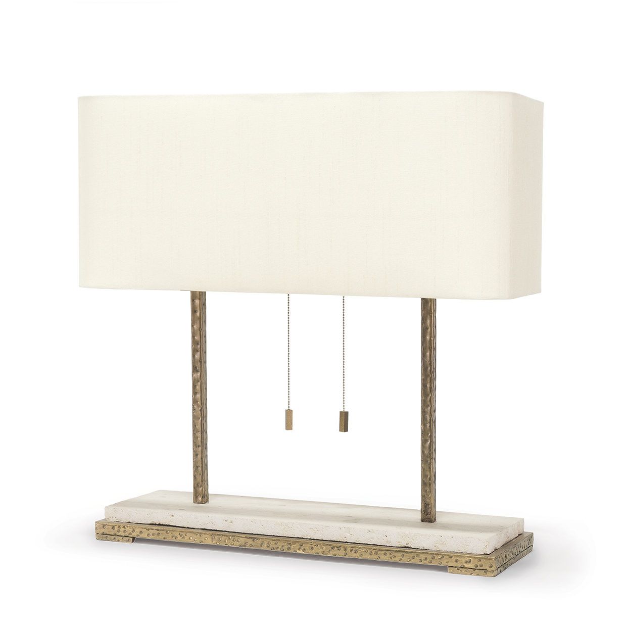 From the Kirk Nix Collection. Hand-hammered metal base and body in antique gold finish accented with a slab of natural Mactan stone with a cream silk rectangular shade and matching hand-hammered metal finial. The double socket features decorative pull chains.