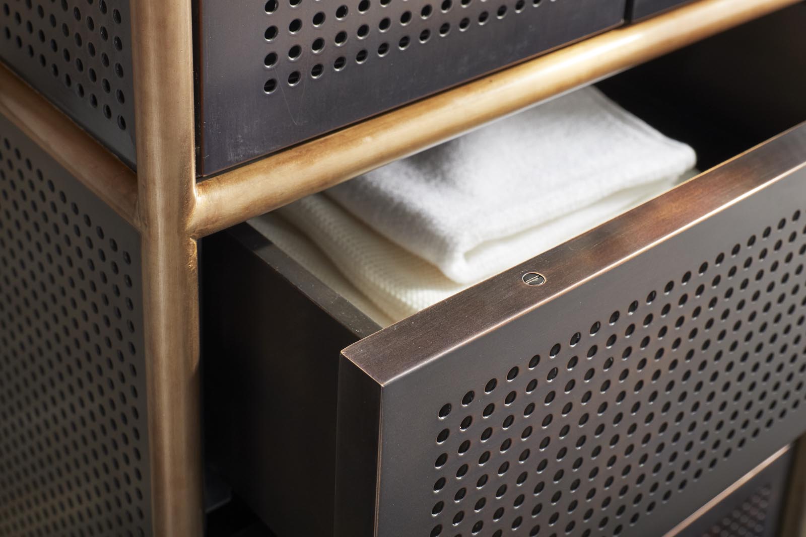 - Perforated paneling adds depth and dimension, with a distressed finish that ensures each piece is unique