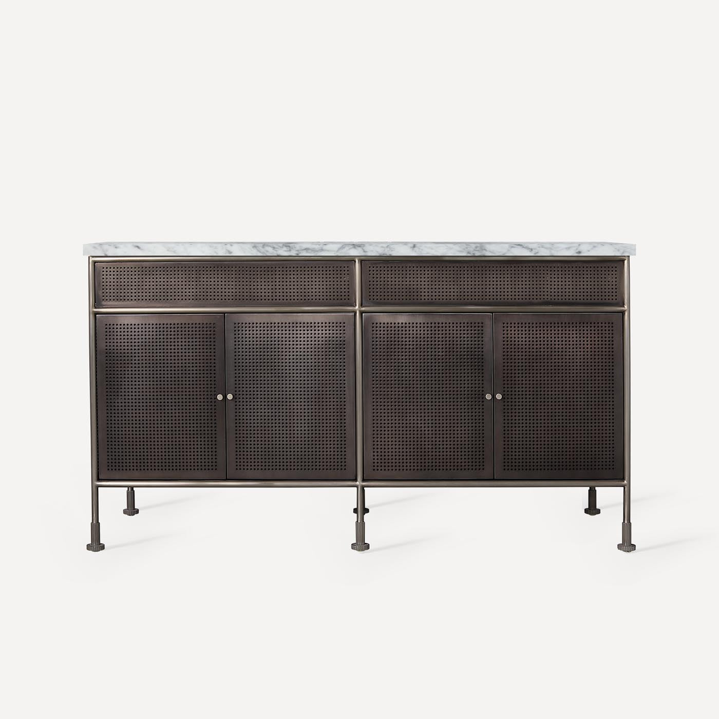 - Perforated paneling adds depth and dimension, with a distressed finish that ensures each piece is unique