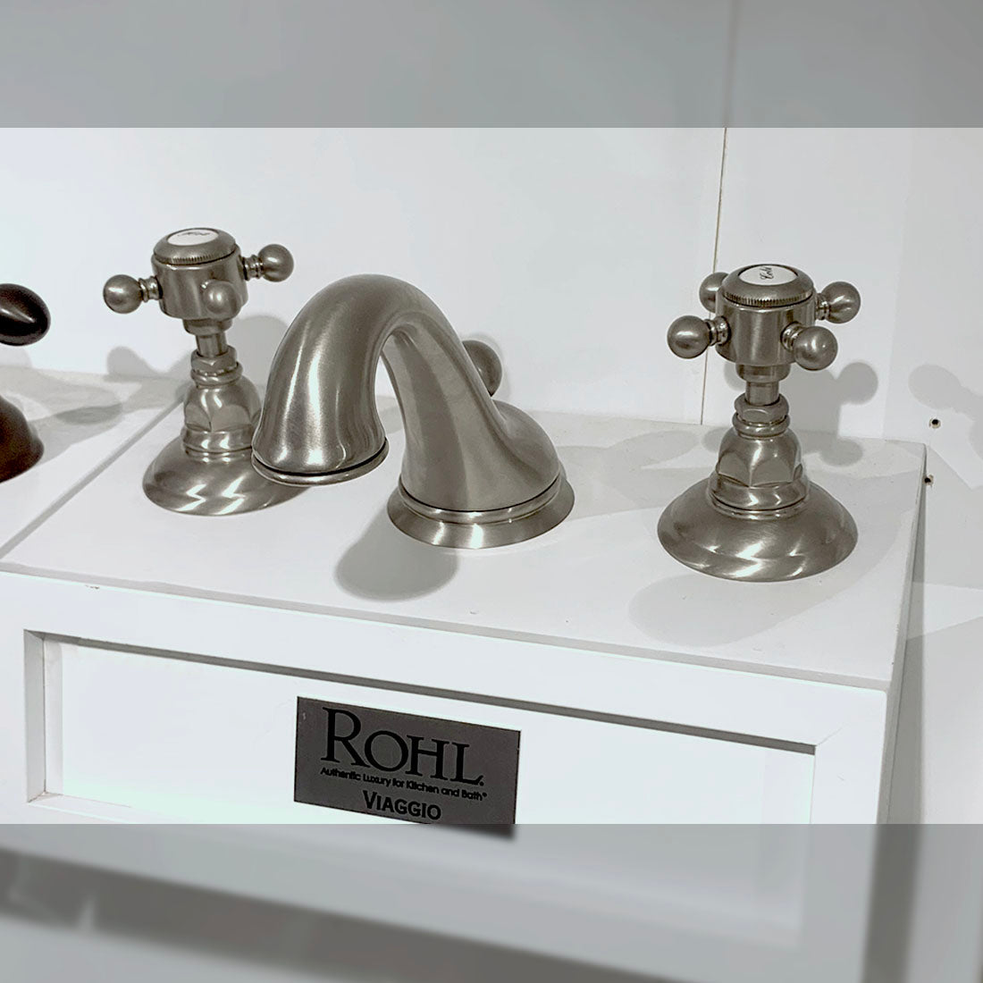 Rohl | Viaggio - Lago D'Orta Classic Widespread Bath Faucet with Metal Lever, in Satin Nickel. Faucet body constructed of brass. Faucet includes ceramic disc valve. Spout Height: 4-7/8". Spout Reach: 4-15/16". Flow rate: 1.2 GPM. Faucet Centers: 15-3/4" max. between centers of outside faucet holes. Maximum deck thickness: 2-3/4". Faucet hole size: 1-3/8".