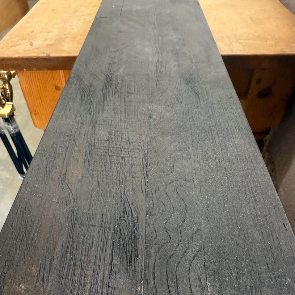 - Filled nail and other holes, oxide stains, filled surface seasoning checks and occasional sound tight knots. Filled with teak and/or epoxy.
