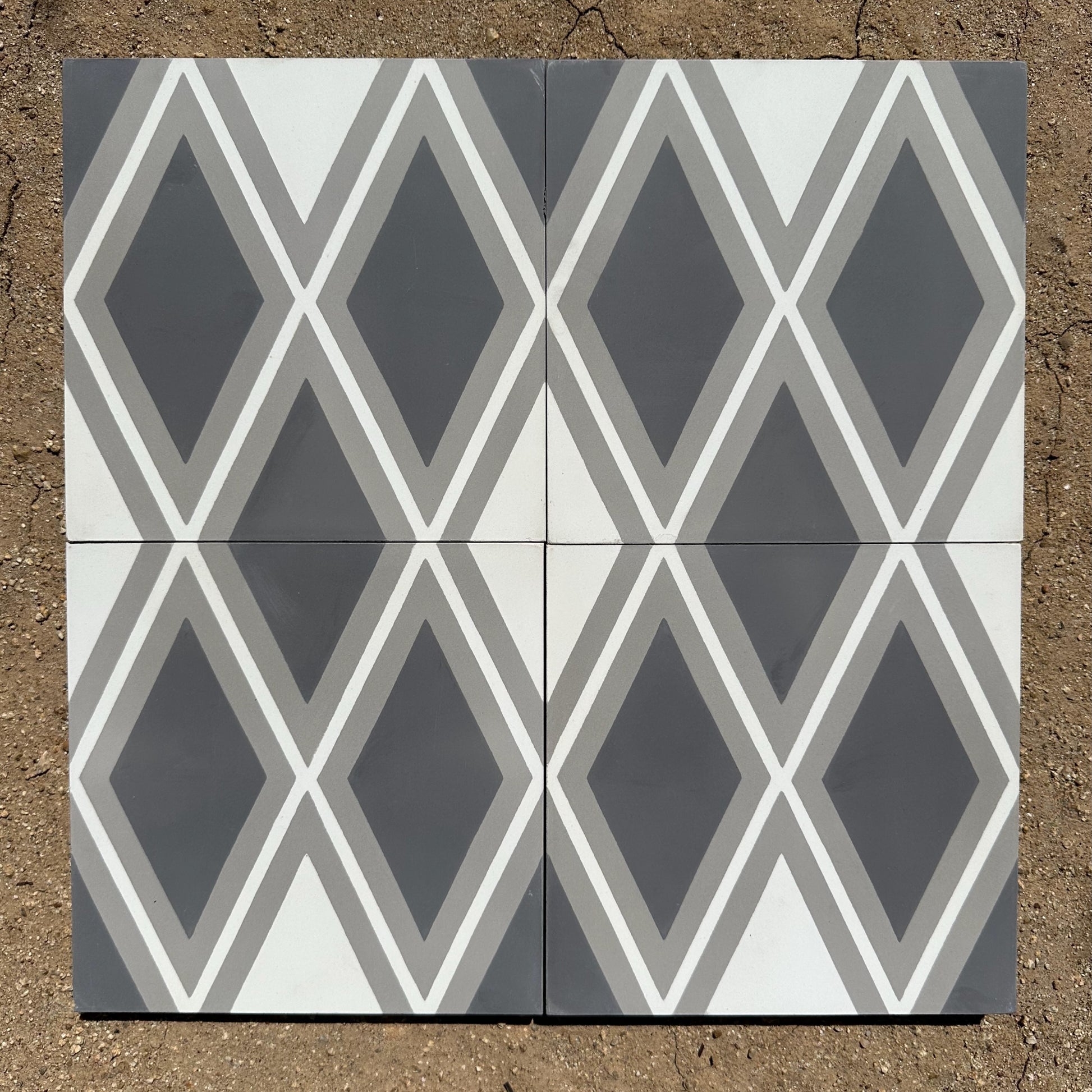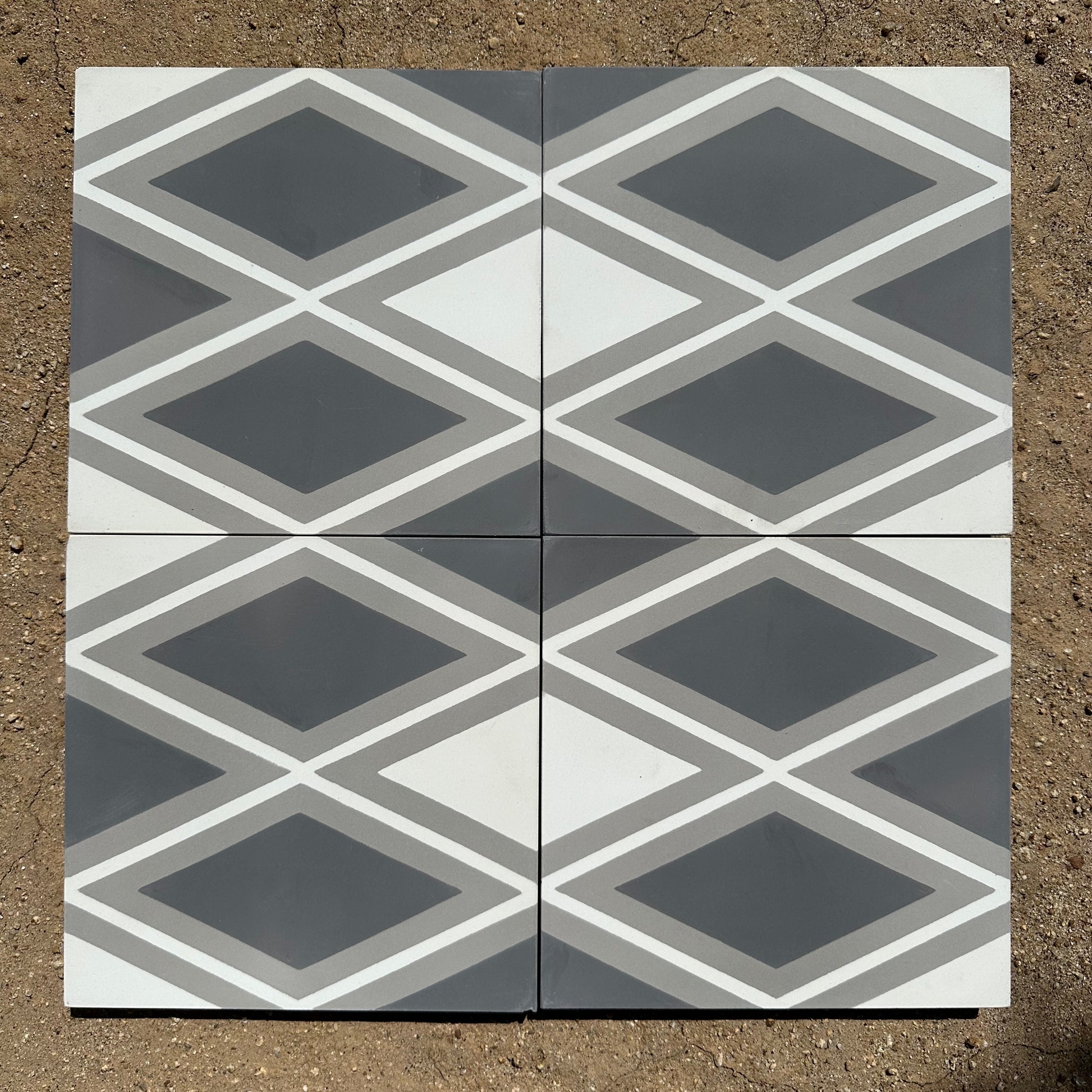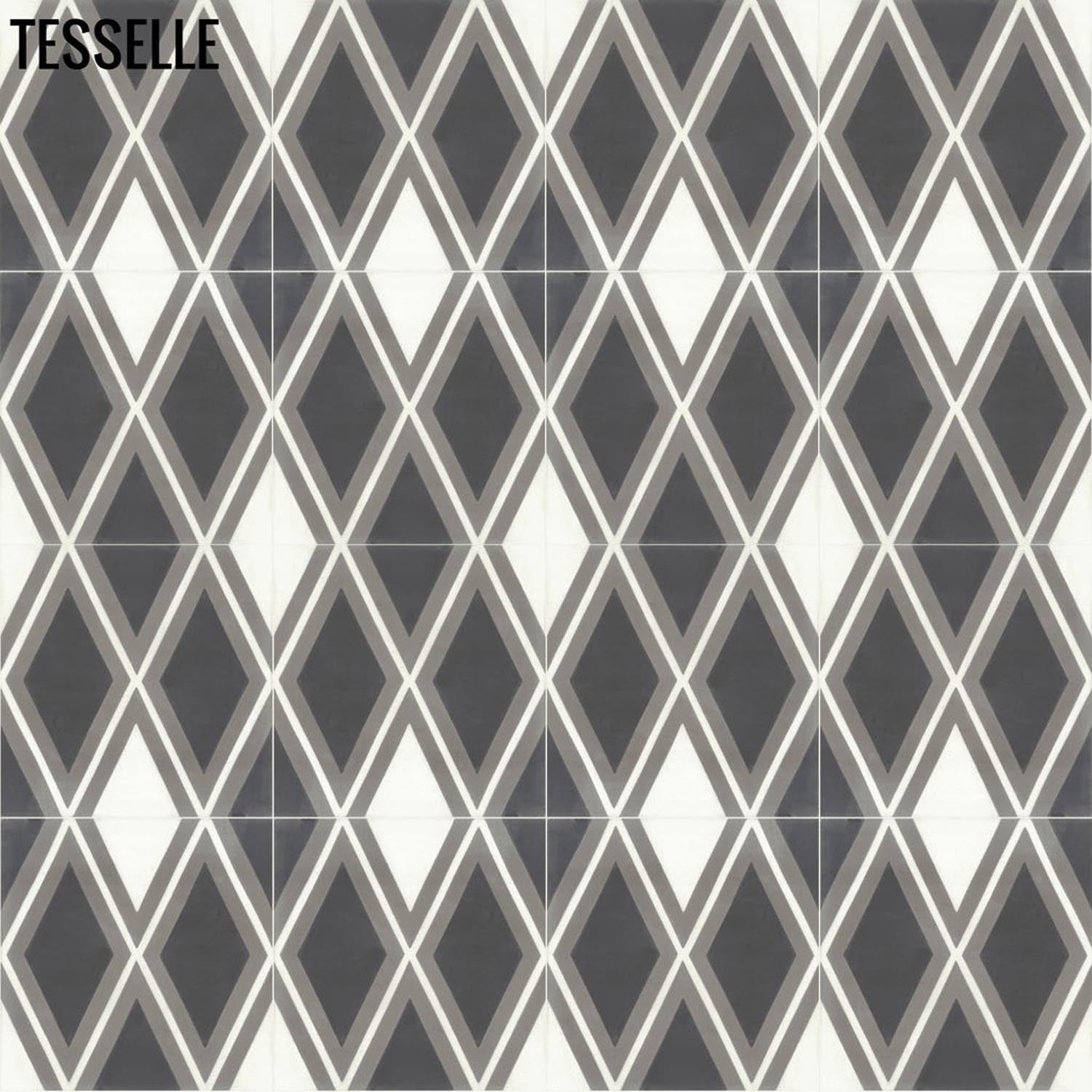 Merino cement tiles in color Lacara creates a repeating argyle-like diamond pattern across your surface. Each tile is hand-pressed. This grey and white color combination will look stunning in many settings. Merino was designed by Karin Jeske.
