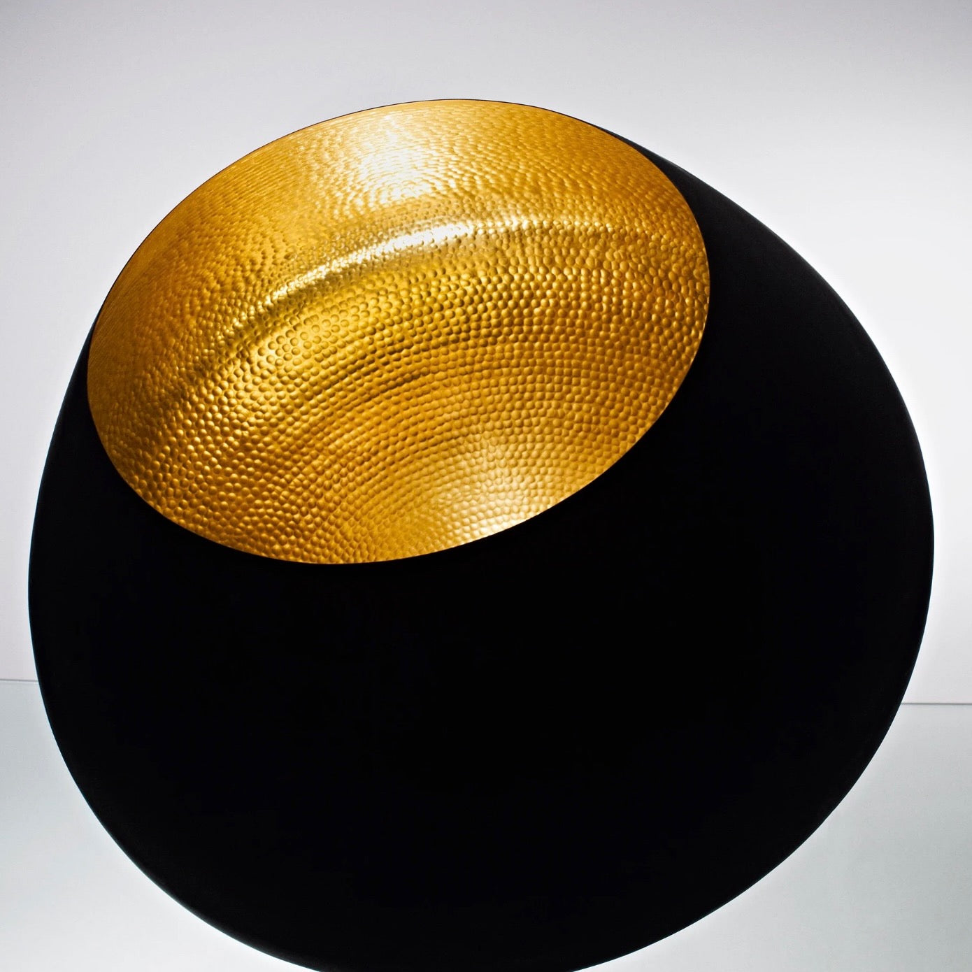Beat Stout throws a attractive curve into British designer Tom Dixon's lineup of pendant lights. Originally conceived during a field trip to India with his Royal College of Art students, the shapes are based on traditional brass cooking pots and water vessels. Using the same time-honored techniques, the lamps are spun and hand-beaten by skilled craftsmen from Moradabad in Northern India. But the technology is pure 21st Century, utilizing an LED light source. The firm Tom Dixon, established in 2002 by the renowned designer and his partner David Begg, encompasses everything from chairs to fragrance as well as a deep dive into lighting. Tom has been recognized with OBE honors and his work sits in museums across the globe including London's Victoria and Albert, New York's Museum of Modern Art and Paris' Centre Georges Pompidou.