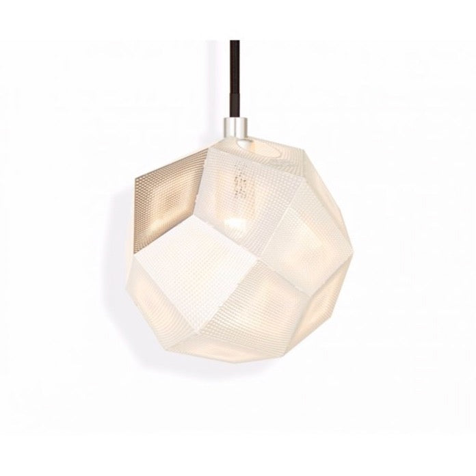 Inspired by the beauty and logic of mathematics, the Tom Dixon Etch Pendant is a delicate, airy geode. Each of the brass panels that comprise the shade are only 0.016 inch thick, and are digitally etched with a highly detailed pattern that creates an intricate interplay of light and shadow, casting nuanced geometric patterns on surrounding surfaces.