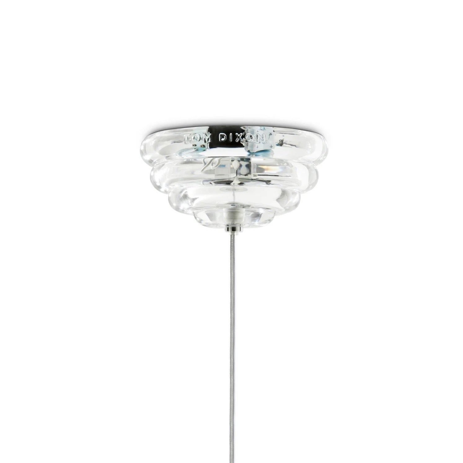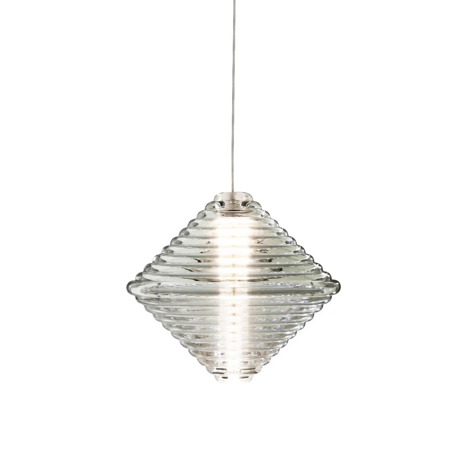 From his transparent glass Press series, Tom Dixon adds a cone-shaped pendant with the same thickly ribbed design. The transparent coils serve to catch and refract the light, lending stripe-like reflections. A distinctive and highly durable fixture, it originates with globs of molten glass dropped into iron molds under tons of pressure to achieve the swirled effect.