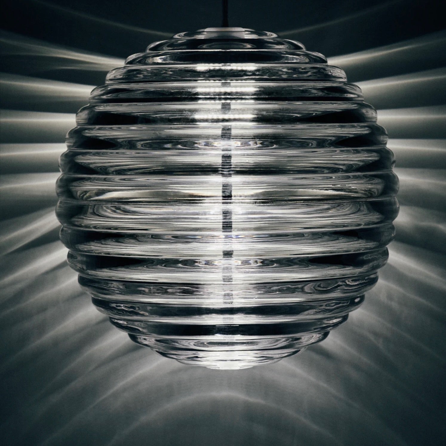 In a classic globe shape, this version of Press is made from the thickest and most transparent glass with a satisfyingly coiled surface. The ribbed design then catches and refracts the illumination in stripy linear patterns. Tom Dixon’s pendant joins a family of lights made by dropping massive globs of molten glass into iron molds under tons of pressure to create the hypnotic and immensely durable result.